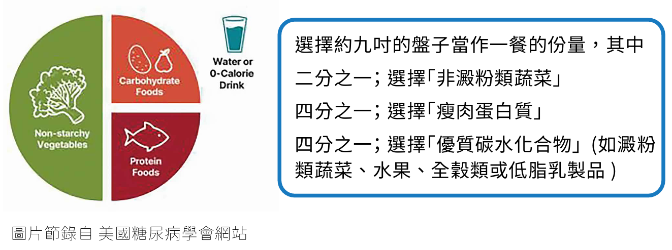 A:糖尿病飲食控制的三大目的:(1)達成體重控制的目標;(2)達成血糖、血壓、血脂控制的目標;(3)減緩或預防糖尿病併發症的發生。如果您母親的飲食已經很清淡,可能要檢視她的飲食種類及體重的變化。有一個常見的錯誤觀念是大家以為不吃飯、不吃甜食,血糖就不會升高,但是卻忘記很多食物都屬於含醣食物,包括全穀根莖類中的;地瓜、芋頭、馬鈴薯、山藥、紅豆、綠豆、玉米、燕麥等等,都算是碳水化合物,這些食物攝取過量仍會導致血糖升高。根據美國糖尿病學會的建議,可以使用簡易版的糖尿病餐盤來協助血糖管理,其操作方式如下: