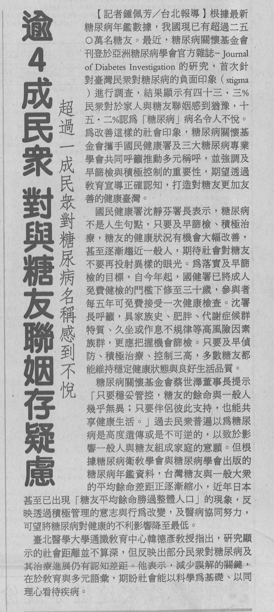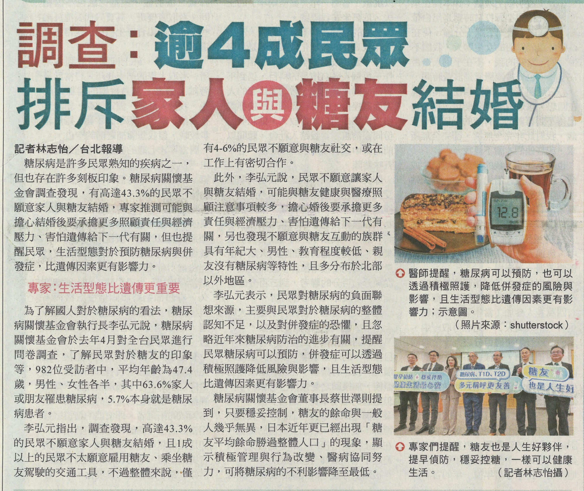 /台灣新生報/ 逾4成民眾對與糖友聯姻存疑慮